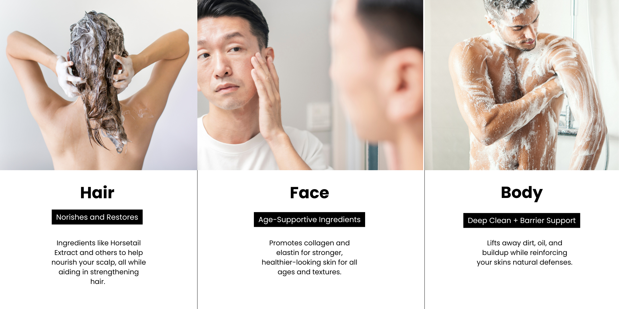 Comprehensive cleansing experience for your hair, face, and body that goes beyond conventional body washes.